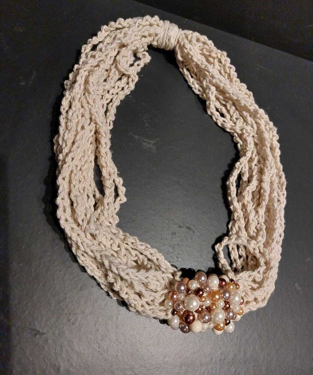 Colar branco, com aplicações de miçangas, feito pela artista Ana Itália.