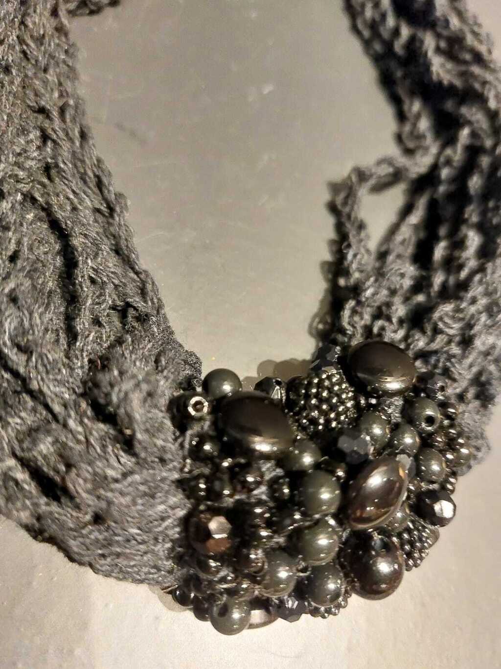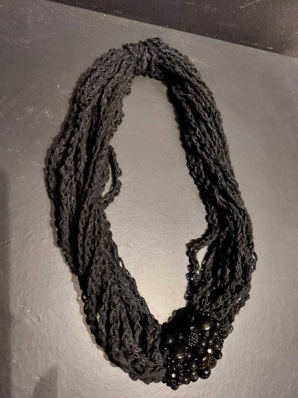 Colar preto, com aplicações de miçangas, feito pela artista Ana Itália.