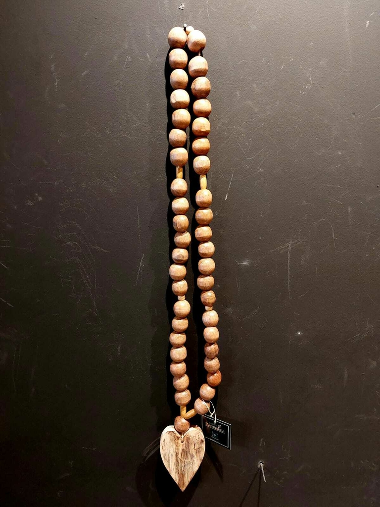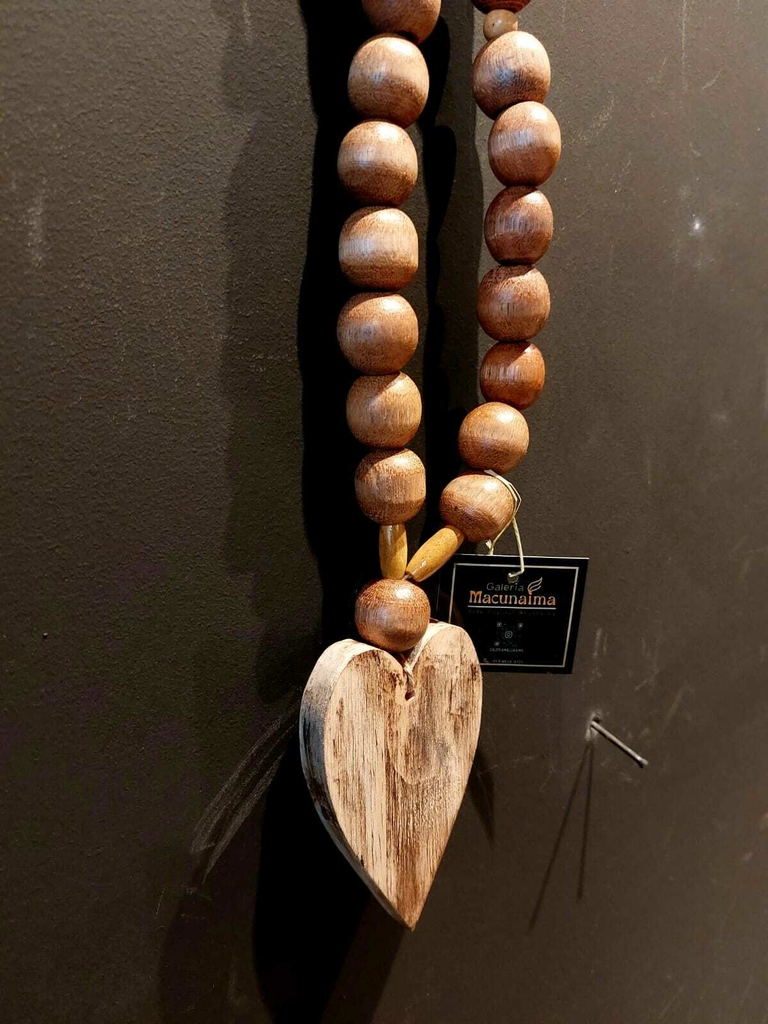 Materiais: Coração de madeira de reflorestamento, contas de madeira, fio Ramí.